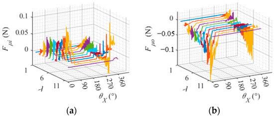 In the process of bearing operation, rollers are influenced by both the raceway and cage. To further investigate the factors contributing to changes in the relative sliding speed of rollers, the drag forces exerted by the raceway on roller slices and the normal forces applied by the cage on rollers during rotation are illustrated in Figure 16 and Figure 17. As can be seen from the figure, the roller is located in the center of the bearing zone () towards the non-bearing zone (). During revolution, both the drag force exerted by the raceway on the roller and the force applied by the cage onto it experience an increase.