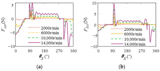 Normal force of the cage on the roller at different rotational speeds. (a) Normal force of the cage on roller point a. (b) Normal force of the cage on roller b.