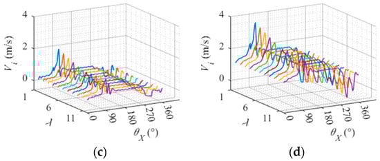 Relative sliding velocity between the roller slice and inner raceway under different torque loads. (a) Torque load 0 N·m. (b) Torque load 3 N·m. (c) Torque load 5 N·m. (d) Torque load 10 N·m.