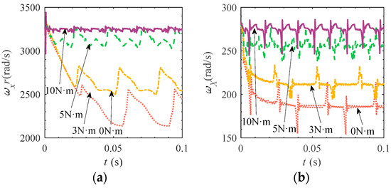 The rotation and revolution speed of rollers under different torque loads are shown in Figure 21. It can be seen that the rotation and revolution velocities of rollers with larger torque loads are larger, and the fluctuation range is smaller and the frequency is larger. This is because the greater the torque load, the greater the contact load between the roller and the raceway, and the smaller the degree of slip between the raceway.