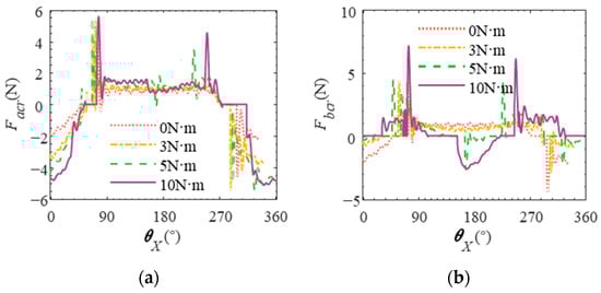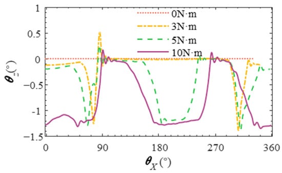 The torque load on the bearing was varied to investigate its influence on the dynamic characteristics and analyze the dynamic performance under different loads. Specifically, four torque loads M were applied: 0 N·m, 3 N·m, 5 N·m, and 10 N·m. The inner ring speed was set at 6000 r/min, and a radial load of = 400 N was applied.