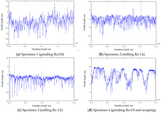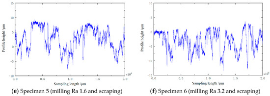 The surface profile of each sample was measured by using the surface profilometer (CONTOURECORD 1600G-24 from TOKYO SEIMITSU, with a resolution of 0.1 μ m/5 mm). The sampling length was set to 20 mm and the sampling interval was 1 μ m. The surface of each sample was measured three times in different areas, resulting in different surface contours. After obtaining the contour height value, the first point of each contour was set to 0 and modified through fitting to correct shape errors in several surface contours caused by differences in sample stiffness. The local surface contours of the six specimens are shown in Figure 3a. Specimen 1 represents grinding Ra 0.8. (b) is specimen 2, representing milling Ra 1.6. (c) is specimen 3, representing milling Ra 3.2. (d) is specimen 4, representing grinding Ra 0.8 and scraping. (e) is specimen 5, representing milling Ra 1.6 and scraping. (f) is specimen 6, representing milling Ra 3.2 and scraping.