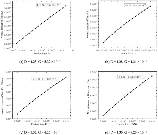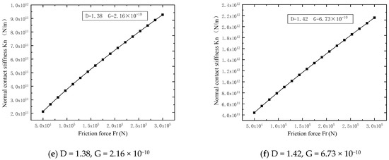 The fractal dimension D and fractal roughness parameter G were obtained from the profile experiments. Based on Equations (20) and Equation (25), the NCS Kn and friction force are functions of the fractal dimension D and fractal roughness parameter G. Then, the NCS Kn and friction force are obtained in Figure 4a, representing the NCS and friction force for D = 1.25, G = 5.32 × 10−12. (b) represents the NCS and friction force for D = 1.28, G = 1.34 × 10−11. (c) represents the NCS and friction force for D = 1.32, G = 4.23 × 10−11. (d) represents the NCS and friction force for D = 1.35, G = 9.23 × 10−11. (e) represents the NCS and friction force for D = 1.38, G = 2.16 × 10−10. (f) represents the NCS and friction force for D = 1.42, G = 6.73 × 10−10.
