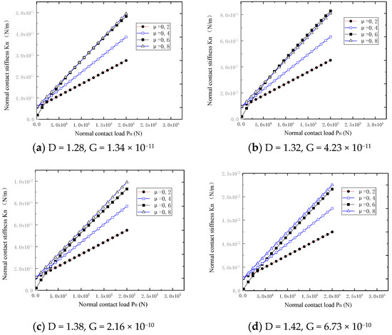 From the curves of the NCS Kn and friction force , it is shown that with the increasing of fractal dimension D and fractal roughness parameter G, the NCS Kn is improved. From the curves in Figure 5, the friction coefficient is changed from 0.2, 0.4, 0.6 to 0.8; (a) represents the NCS for D = 1.28, G = 1.34 × 10−11 (the maximum value of NCS is about 5 × 1011), (b) represents the NCS for D = 1.32, G = 4.23 × 10−11 (the maximum value of NCS is about 8 × 1011), (c) represents the NCS for D = 1.38, G = 2.16 × 10−10 (the maximum value of NCS is about 1 × 1012), and (d) represents the NCS for D = 1.42, G = 6.73 × 10−10 (the maximum value of NCS is about 2.5 × 1012). Hence, for a certain fractal dimension D and fractal roughness parameter G, with the increasing of the friction coefficient, it is shown that the NCS Kn is improved in Figure 5.