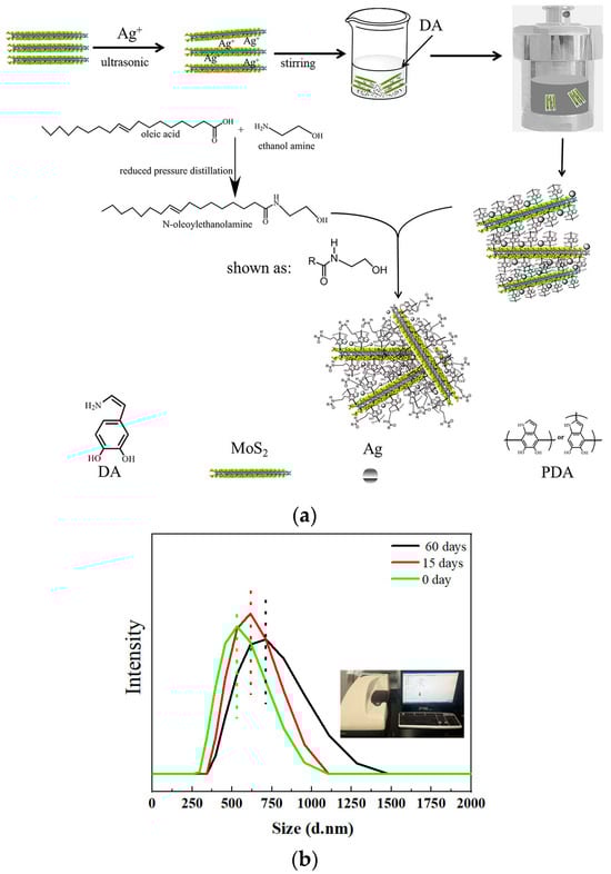 (a) Schematic illustration of the synthesis process of Fc-MoAg; (b) sizes of Fc-MoAg in base oil after 0 day, 15 days, and 60 days.
