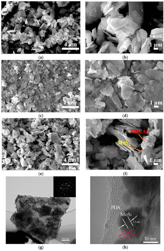 The morphology and corresponding elemental mapping of bulk MoS2, exfoliated MoS2 and Mo0.5Ag20 were determined by FE-SEM and EDXA, respectively. It can be seen (Figure 2a,b) that the bulk MoS2 exhibits a lamellar stacking structure. After ultrasonic treatment, the bulk material is broken into smaller sheets with a thickness of less than 100 nm (Figure 2c,d). In the case of MoAg, the MoS2 nanosheets were uniformly covered with nanoparticles, which can be attributed to PDA/Ag particles (Figure 2e,f). The TEM image presented in Figure 2g reveals the presence of particles with a diameter of ca. 20 nm that cover the surface of the MoS2 sheets (with the thickness of less than 20 nm), confirmed by selected area electron diffraction analysis [18]. The high-resolution TEM image in Figure 2h shows inter-layer spaces of ca. 0.7 nm associated with the MoS2 sheets, which exceeds that of bulk MoS2 (0.62 nm) [19]. The analysis has determined a lattice spacing of ca. 0.24 nm for Ag (111), where a significant Ag (111) component was found in the inter-layer spaces of the MoS2 sheets, suggesting the successful insertion of Ag. The amorphous species present on the MoS2 sheets and Ag particles can be attributed to polydopamine.