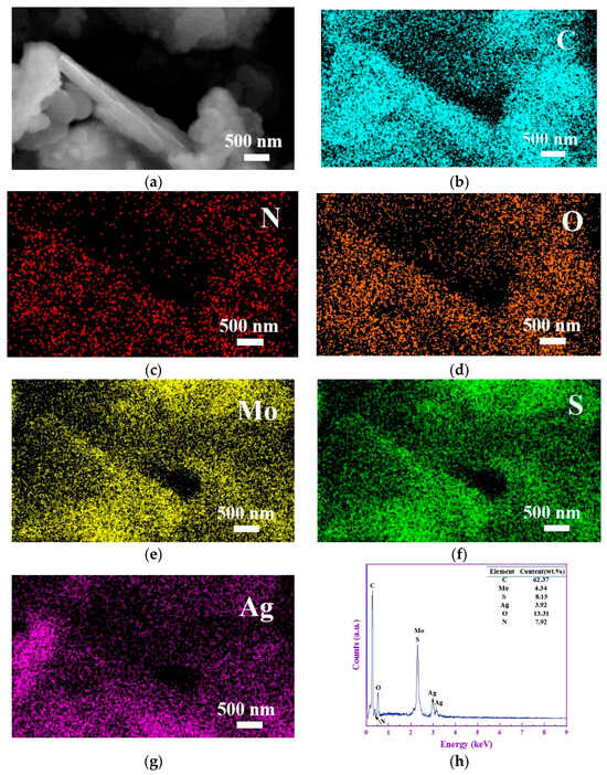 The SEM image, elemental mapping, and EDS analysis presented in Figure 3 have further confirmed the presence of MoS2 (with an atomic ratio of Mo:S = 1:2) and the uniform distribution of C, O, Ag, and N on the MoS2 nano-sheets. The FT-IR and TG spectrum of the Fc-MoAg means that the condensation of N-oleoylethanolamine and polydopamine and the functionalization of the composites were executed (shown as Figure S1) [16,20,21,22].