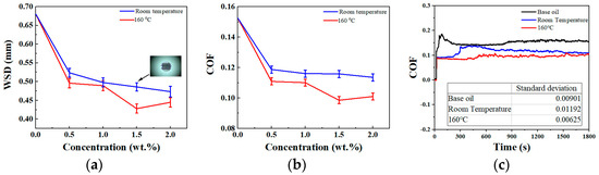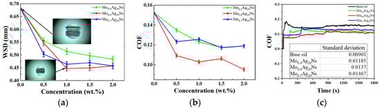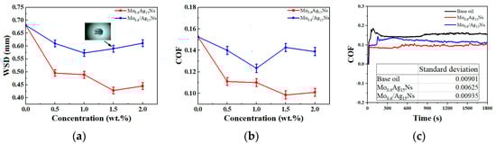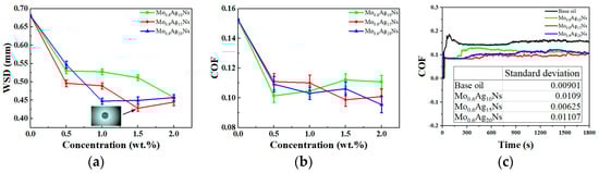 (a) WSD–concentration curves, (b) COF–concentration curves for BO containing Fc–MoxAg20 with different MoS2 contents and (c) COF–time curves for BO and BO containing Fc–MoxAg20 with different MoS2 contents (concentration: 1.0 wt.%), respectively.
