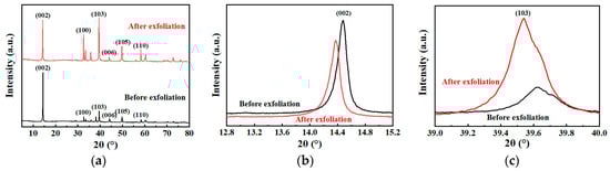 The test results have revealed that MoAg synthesized using the in situ hydrothermal method improved the tribology properties of BO. In order to probe the underlying wear mechanism, the XRD patterns of MoS2 before and after exfoliation are shown in Figure 9. The peaks at 14.2°, 32°, 39.5°, 44°, 50° and 58° are attributed to the (002), (100), (103), (006), (105) and (110) planes, respectively (JCPDS card reference 37-1492) [25]. The Bragg equation (2dsinθ = nλ, where n = 1, and λ = 0.154 nm) was used to estimate the interplanar spacing. The diffraction peak due to the MoS2 (002) plane was shifted from 14.47° to 14.36° after exfoliation, corresponding to an increase in the interplanar spacing of (002) from 0.612 nm to 0.616 nm [26]. All the MoS2 XRD peaks were moved to lower 2θ following exfoliation, including the (103) plane, representing an increased interplanar spacing of the crystal face [27,28,29,30]. The Scherrer equation was used to calculate the size (D) of the MoS2 crystal in the direction perpendicular to the (002) plane:
