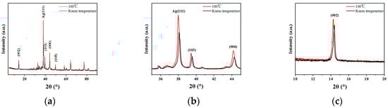 The XRD analysis of Mo0.6Ag15 synthesized with and without hydrothermal treatment is presented in Figure 10. The diffraction peaks at 14.2°, 39.5°, 44°, 58°, and 50° correspond to the (002), (103), (006), (110) and (105) planes of MoS2, respectively. The peak at 38.0° is due to the Ag (111) plane (Figure 10a). The diffraction peaks of the composites were shifted to lower values following hydrothermal treatment, suggesting that this step resulted in an increased composite interplanar spacing. The diffraction peak due to the MoS2 (002) plane was shifted from 14.37° to 14.26° following the hydrothermal step, corresponding to an interplanar spacing increase from 0.616 nm to 0.621 nm. Furthermore, the Ag (111) diffraction peaks were moved to the left and exhibited an increased intensity, indicating that the high temperature and pressure treatment improved the degree of crystallinity and increased the interplanar spacing. The Ag size in the direction perpendicular to (111) (based on the Scherrer equation) increased from 36.09 nm to 38.94 nm as a result of the hydrothermal treatment.