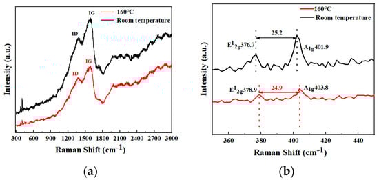 Raman spectroscopic analysis of the composites before and after hydrothermal treatment is shown in Figure 11a. The ID/IG values were increased from 0.84 to 0.86 as a result of the high temperature and pressure treatment, suggesting the formation of a new carbon phase due to PDA. The characteristic peaks of hexagonal MoS2 at 378 cm−1 and 401.2 cm−1 correspond to the E12g and A1g modes of in-plane and out-of-plane vibrations in the S-Mo-S linkages of the MoS2 layer (Figure 11b) [1,31,32,33,34,35]. These wavenumbers are lower than the values associated with the E12g (391 cm−1) and A1g (411 cm−1) modes of bulk MoS2 [18]. The red shifts of the A1g and E12g bands for MoAg can be attributed to the decreased interlayer Van der Waals force and the influence of intercalation agents, respectively. The gap between the E2g and A1g peaks for Mo0.6Ag20 decreased from 25.2 cm−1 to 24.9 cm−1 as the composite treatment temperature was increased from room temperature to 160 °C, suggesting a decrease in the thickness of the nanosheets [36,37]. Exposure to high temperature and pressure can promote a stripping of MoS2 and decrease the van der Waals forces.