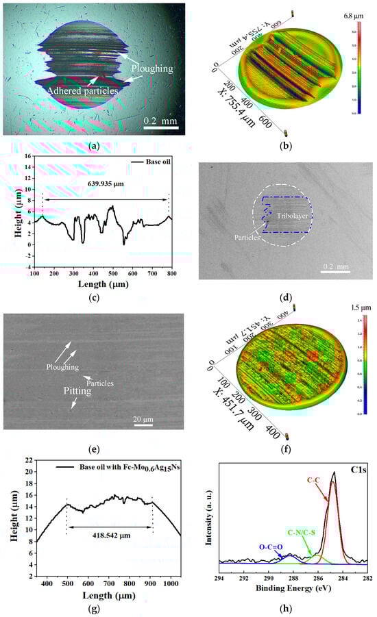 The optical images, 3D profile images, SEM images and cross-sectional curves of the worn surfaces lubricated with base oil without (a–c) and with (d–g) additives, respectively; the XPS spectra of worn surfaces lubricated with BO-c-Mo0.6Ag15 (h–n).