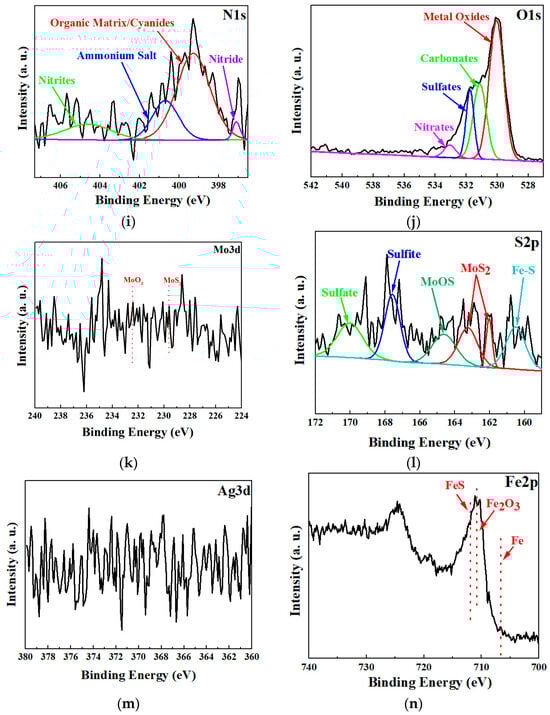 The worn surfaces under lubrication with BO containing Fc-Mo0.6Ag15 were characterized to determine the wear mechanism. The optical or SEM images, 3D skeleton maps and corresponding cross-sectional curves of the steel balls using pure BO and BO with Fc-Mo0.6Ag15 are shown in Figure 12a–g, respectively. The worn surfaces associated with pure BO are coarse, with a diameter and depth of wear scars of ca. 0.68 mm and 0.75 µm, respectively. In contrast, the worn surface for BO containing Fc-Mo0.6Ag15 was much smoother, with a diameter and depth of scarring of 0.43 mm and 0.21 µm, respectively, significantly reduced when compared with pure BO. Comparing optical and SEM images of the samples, BO with Fc-Mo0.6Ag15 surfaces displayed a small, completely round form and a shallow groove. This event demonstrated that the tribolayers could have penetrated between the two bodies in operation, thus improving the tribological performance by reducing COF and WSD. Possibly, soft metal compounds may get trapped at the asperity level and stay on the surface, rendering easy sliding and improved tribology. The elemental maps and energy dispersive X-ray analysis (EDXA) profile have established the distribution of C, N, O, Mo, S, Ag and Fe on the worn surfaces of steel balls lubricated with BO containing Fc-MoAg (Figure S3). The results of XPS analyses of the worn surfaces lubricated with BO containing Fc-MoAg are shown in Figure 12h–n. The C1s signal has been deconvoluted into three peaks at 284.82 eV, 286.14 eV, and 288.32 eV, corresponding to C-C, C–N/C–S, and O–C=O bonds, respectively [42,43]. The high-resolution N1s peaks at 397.09 eV, 404.61 eV, 399.27 eV and 400.71 eV are assigned to nitride, nitrites, organic matrix/cyanides and ammonium salt, respectively. Moreover, the O1s peaks associated with the worn surfaces correspond to metal oxides (530.05 eV), carbonates (531.13 eV), sulfates (531.76 eV), and nitrates (533.07 eV). Weak Mo3d peaks at 232.41 eV and 229.59 eV are attributed to MoO3 and MoS2, respectively [44]. In addition, weak S2p signals at 160.47 eV, 167.62 eV and 169.20 eV are due to FeS, sulfite and sulfate, respectively [44,45]. The weak S2p signals at 162.07–163.27 eV are due to MoS2 [44,45]. The weak Ag3d spectrum could not be identified, which might be attributed to the small percentage of silver on the worn surfaces. The Fe2p peaks at 710.84 eV, 712.18 eV and 706.70 eV are ascribed to Fe2O3, FeS and iron, respectively [46]. The XPS results demonstrate that a lubrication film containing MoS2, FeS, MoO3, Fe2O3, carbon-nitrogen compounds and other compounds was formed, which served to lower the COFs and WSDs during testing [47]. The results have established that the expanded interlayer spacing of the MoS2 sheets due to exfoliation and/or hydrothermal treatment and the tribo-films containing sulfide, oxide, and carbon-nitrogen compound served to improve the tribological properties of steel balls lubricated with BO containing Fc-MoAg.