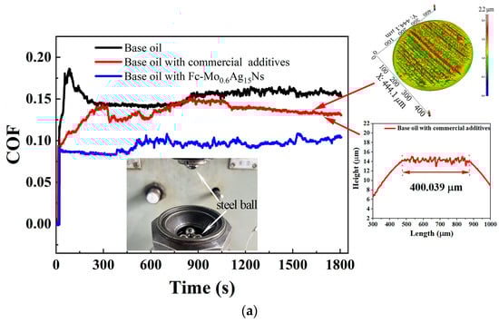 The four-ball wear tests utilizing steel/steel, steel/zirconia and zirconia/zirconia pairs under BO lubrication with/without functionalized Mo0.6Ag15 (wt. 2.0%) and commercial additives (11.5 wt.%) generated the results presented in Figure 13. The average COFs for BO, additives and BO containing Fc-Mo0.6Ag15 were 0.152, 0.13 and 0.095, respectively (Figure 13a). The COFs of the steel balls lubricated with BO containing Fc-Mo0.6Ag15 were unchanged over the first twenty minutes, and then exhibited a sharp increase to 0.12. The COFs of steel balls lubricated with BO oil and BO containing commercial additives were larger and showed a greater degree of fluctuation when compared with the BO containing additives. The 3D skeleton image and corresponding cross-sectional curves of the worn surface in BO containing commercial additives exhibited a WSD and depth of groove of ca. 0.410 mm and 2.20 µm, respectively. The deeper grooves associated with the wear scars under BO containing commercial additives lubrication indicate that BO oil containing Fc-Mo0.6Ag15 (1.5 µm groove depth) offers superior anti-wear (Figure 13a). The COF–time curves for the steel/zirconia pairs are shown in Figure 13b under lubrication with a load of 98N and a speed of 500 rpm for 30 min. It can be seen that the three profiles are essentially time invariant, and the average COFs for BO, BO with functionalized Mo0.6Ag15 and commercial additives were ca.0.180, 0.130, and 0.140, respectively. This response has established enhanced and near equivalent friction reduction for steel/zirconia using BO with Fc-Mo0.6Ag15 and commercial additives. Moreover, the depth of the worn grooves for the combined BO and-Fc-Mo0.6Ag15 was 0.08 µm, appreciably smaller than the value using BO (0.141 µm) or lubricants with commercial additives (0.713 µm). The WSD of steel/zirconia in BO with Fc-Mo0.6Ag15 was ca.0.200 mm, lower than the values recorded for BO (0.260 mm) and commercial oil (0.220 mm). The COF–time curves and corresponding 3D profiles and cross-sectional curves for the zirconia/zirconia pair are shown in Figure 13c, yielding values for BO containing Fc-Mo0.6Ag15 and commercial additives of 0.148 and 0.151, respectively, lower than that recorded for BO alone (0.16). The groove depth for BO was 0.906 µm, greater than that observed for BO with Fc-Mo0.6Ag15 (0.840 µm) and commercial additives (0.679 µm). Both BO containing Fc-Mo0.6Ag15 and commercial additives exhibit improved friction reduction relative to pure BO for the three test pairs. The BO containing Fc-Mo0.6Ag15 delivered lower COFs, WSDs and groove depths than commercial additives in the case of the steel/steel and steel/zirconia pairs. Moreover, the COFs and depth of the wear scar grooves associated with the zirconia/zirconia pair were smaller when using BO containing Fc-Mo0.6Ag15 and commercial additives than pure BO.