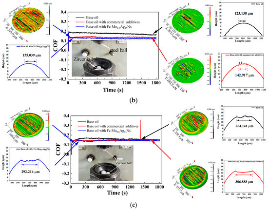 COF–time curves, corresponding 3D profile images and cross-sectional curves of the worn surfaces for lubrication using base oil with commercial additives (11.5 wt.%), and with/without Fc-Mo0.6Ag15 (wt. 2.0%) in the case of (a) steel/steel, (b) steel/zirconia, and (c) zirconia/zirconia pairs, respectively.