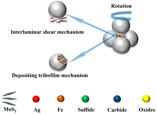 The results show that the MoS2/metal composites exhibit enhanced tribological behavior as lubricant additives. Both nanocomposite synergy and the tribofilm play important roles in achieving reduced friction and improved anti-wear. The exfoliation, permeation of Ag+, and growth of nano-silver decrease the size and thickness of MoS2 nanosheets and enlarge the interplanar spacing of the (002) plane, which decreases Van der Waals forces in the perpendicular direction and provides good lubrication. On the other hand, the tribofilm containing sulfide, oxide, carbide, and other compounds protects the steel balls from damage to improve the tribological properties (shown as Figure 14).