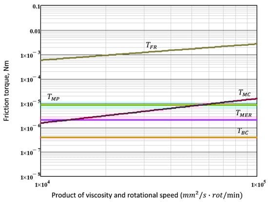 Imposing the geometrical characteristics of the 7000C ACBB, for an axial load of Fa = 3.11 N and for an oil viscosity of 150 mm2/s, all the components included in Equation (1) were simulated and are presented in Figure 2.
