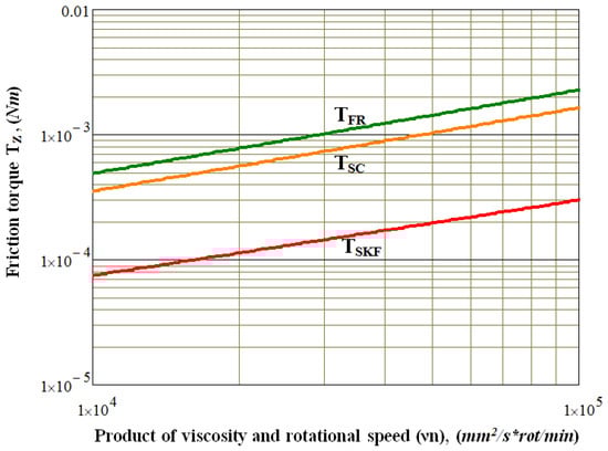 A comparison between the simulated friction torques TFR, TSKF and TSC is presented in Figure 3 for the 7000C ACBB operating with an axial load of 3.11 N with a kinematic viscosity of 150 mm2/s. It can be seen that the friction torque determined using the Houpert IVR methodology has the highest values for imposed conditions.