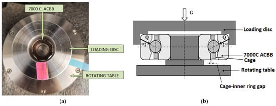 Figure 4 shows the general view of the Tribometer CETR UMT-2 with the testing ring mounted on the rotating table. Figure 5 presents the details of the testing ring components. The standard 7000C ACBB has 8 balls separated by a phenolic resin cage guided on the inner race. As presented in Figure 5b, a loading disc mounted on the outer ring generated an axial load of Fa = 3.11 N, corresponding to the contact load Q = 0.763 N for each normal ball-races. The maximum Hertzian ball-race contact pressures are 0.3 GPa and 0.40 GPa for outer and inner ball-race contacts, respectively.