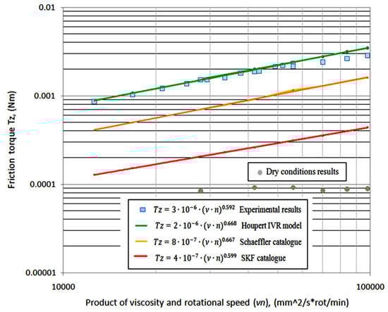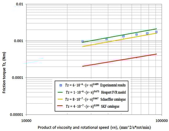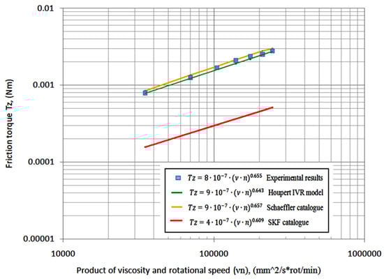 The experiments were also ran with the lubricant Grade SAE oil T90, and the results are presented in Figure 8. To compare the experimental results to the results obtained using the Houpert IVR model, the SKF and Schaeffler relations, the variation in the experimental friction torque was presented as a function of the product between the kinematic viscosity and the rotational speed (ν·n) where ν is given in mm2/s, and n is given in rot/min.