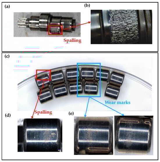 Damage on RV reducer. (a) spalling on crankshaft; (b) enlarged view of spalling on crankshaft; (c) wear and spalling on bearing rollers; (d) enlarged view of spalling on roller; (e) enlarged view of wear on rollers.