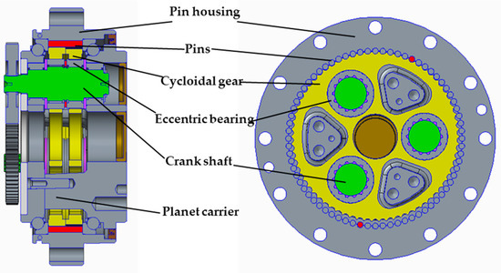 The RV reducer consists of six main components: planetary gears, crankshafts, cycloidal gears, pins, planetary carriers and bearings, as depicted in Figure 2. The transmission system involves low transmission ratio planetary gears and high transmission ratio cycloid gear pins. Therefore, the load is mostly carried by cycloidal gears and eccentric bearings with a 120° phase difference. In order to analyze the mechanical and lubrication performance of the eccentric bearings, a model combining FEM and EHL methods is proposed in this section. The simulation process is shown below: Firstly, the FEM of the RV reducer was established considering the six components. Secondly, the EHL method was adopted to calculate the oil film pressure between the rollers and the crankshaft. Then, the optimization of the roller’s profile could be evaluated according to the response of oil film pressure.
