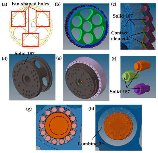 The FEM of RV reducer. (a) structure with fan-shaped holes; (b) mesh of cycloidal gear and pins; (c) fine mesh of the contact area; (d) mesh of planet carrier; (e) mesh of the RV reducer; (f) mesh of crankshaft; (g) structure of eccentric bearing; (h) mesh of eccentric bearing.
