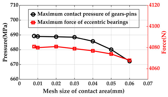 Figure 4 gives the mesh sensitivity results of the FEM. There is no doubt that both the maximum contact pressure of gear pins and the maximum force of eccentric bearings reach a stable level when the mesh size is lower than 0.03 mm.