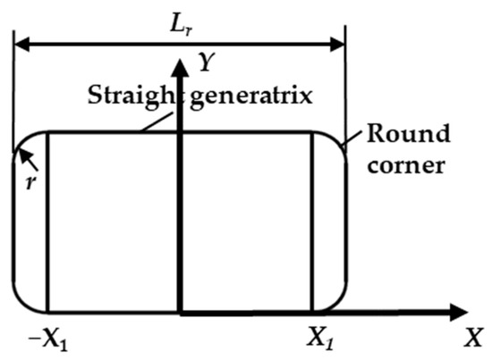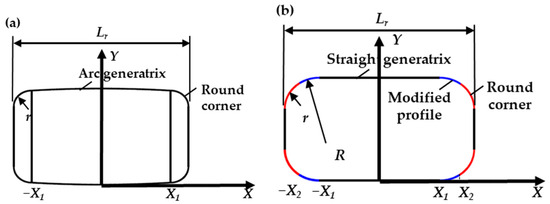 Rollers applied in the eccentric bearings of the RV reducer are usually designed with straight generatrix and round corners as shown in Figure 5. The equation of the roller’s profile is expressed as Equation (8). Typically, stress concentration is induced at the location of the round corners. Hence, modification of the profile of the roller is certainly necessary. In this section, two types of profiles are generated to investigate the effect of the roller’s shape on the pressure distribution as illustrated in Figure 6.