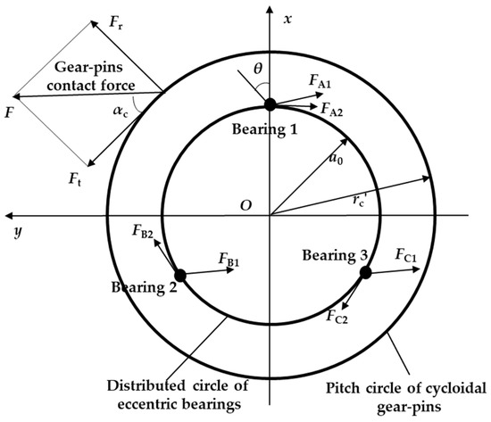 - The whole cycloidal gear is regarded as a rigid body and the contact force F is evenly assigned among the three eccentric bearings;