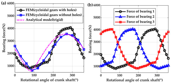 Figure 8 depicts the resultant force of the eccentric bearings in the RV reducer. In Figure 8a, the variation of a single eccentric bearing’s force considering the rotational of the crankshaft by three numerical models is presented. The analytical result of the bearing’s resultant force is obtained by solving analytical Equation (11). A different FEM from which the fan-shaped holes in the cycloidal gears are omitted is presented for comparison in Figure 9. As the fan-shaped holes of the cycloidal gears are removed, the rigidity of the reducer is higher. It can be observed that the force distribution curve presents like a cosine curve with the rotating of the crankshaft. Note that the maximum force and minimum force obtained from the FEM (cycloidal gears without holes) are nearly the same as that of the analytical model. Compared to the analytical model, the maximum value and the minimum value of the FEM (cycloidal gears with holes) increase by about 15% and 26%, respectively. This is due to the uneven local deformation of the cycloidal gear while considering the flexibility of the cycloidal gear (red square area in Figure 3a). Special attention should be focused on structural flexibility in the case of RV reducer’s force analysis.