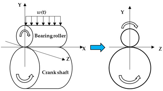Figure 10 depicts the contact of the bearing roller and crankshaft, which is predicted as a cylindrical contact. X and Z axes represent the roller’s axis direction and rolling direction, respectively. The idealized Hertzian line contact pressure distribution equation is listed as Equation (13). Variable ph is introduced as the maximum contact pressure calculated by Equation (14).