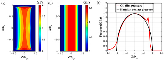 Figure 11 illustrates the pressure distribution of the straight generatrix roller obtained by the EHL method (Equation (1)) and Hertzian method (Equation (13)). The two-dimensional oil film pressure calculated by the EHL method is shown in Figure 11a. It can be obviously seen that pressure concentration occurs at the edges of the roller. In Figure 11b, the Y-Z plane contact pressure remains identical along the axis direction of the roller in idealized Hertzian theory. The pressure of the Y-Z plane (X = 0) of Figure 11a,b is illustrated in Figure 11c. The result in Figure 11c indicates that the oil film pressure obtained by the EHL method is reliable and accurate. Viewing from the EHL oil film pressure distribution curve, an obvious pressure spike in the outlet of the contact region is generated. The value of ph is equivalent to 1.56 GPa as shown in Figure 11c. The results of Figure 11 are in accordance with that in Reference [27].