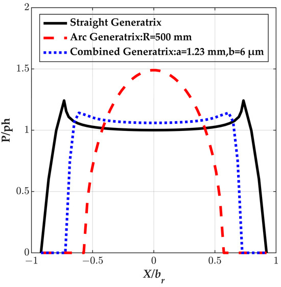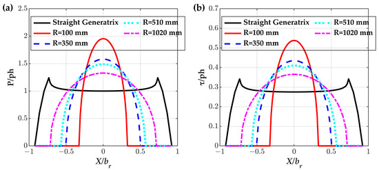 In this section, the effect of the profile’s arc radius on EHL performance is investigated by considering oil lubrication. As described in Section 2.2, the oil film pressure distribution P of the solution domain in the X-Z plane between the roller and the crankshaft can be obtained by solving Equation (1). The oil film pressure distribution considering varying arc radius with constant Lr and r values (br = Lr/2) along the roller axis direction (X axis, Z = 0) is illustrated in Figure 12a. The oil film pressure distribution along the roller axis direction (X axis, Z = 0) can be significantly affected by arc radius as changes obviously with varying arc radius. In addition, the result of a straight generatrix shape roller (the black curve in Figure 12a) is induced to compare. The analysis reveals a pronounced edge effect in the case of the straight generatrix shape roller, increasing the propensity for damage at the roller’s edges. Therefore, damage is more likely to generate at the edge of the roller. Profile modification is necessary for the roller in order to decline the edge effect. Arc generatrix is the most familiar modified profile for rollers from a theoretical view. The contact state converts to point contact in the case of arc generatrix and damage is most likely to appear at the middle segment of the roller. As the arc radius decreases from 1020 mm to 100 mm, the maximum oil film pressure increases from 1.32ph to 1.95ph. In contrast, the maximum oil film pressure induced by the edge of the straight generatrix shape roller is 1.24ph. In order to further decrease the stress concentration, the radius of the roller needs to be raised to a higher value. The modification quantity at the edge of the roller is difficult to ensure with a higher radius value due to limitations in the mechanical machining capacity. Hence, this paper will not investigate the roller’s profile whose modification quantity is less than 5 μm (the arc radius of 1020 mm corresponds to a modification quantity value of 5 μm).