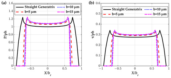 This section examines the impact of modification quantity b and modification length a to identify the best values that decrease the oil film pressure and the maximum shear stress. The oil film pressure and maximum shear stress distribution along the roller axis direction (X axis) would be influenced by the modification parameters as a, b and R determine in Equation (2). Figure 13 illustrates the oil film pressure and maximum shear stress distribution along the roller’s axis direction, with a focus on the effects of b. The straight generatrix shape roller can be regarded as the situation of b = 0 μm. As the modification quantity increases from 5 μm to 15 μm, the maximum oil film pressure and the maximum shear stress grow simultaneously. It can be explained as the radius R in Figure 6b decreases with the rising of modification quantity b, which aggravates the geometric discontinuity of the straight segment and modified segment. A further novel finding is that a modification quantity of 0 μm (straight generatrix) could also induce oil film pressure and maximum shear stress increasing at the roller’s edges. This phenomenon demonstrates that a turning point exists as the modification quantity increases from 0 μm to 15 μm.