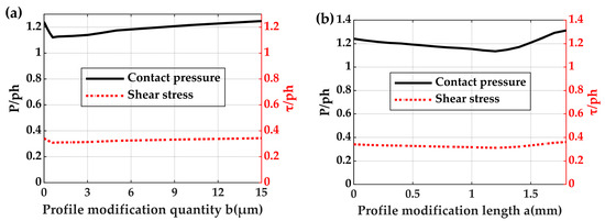 Pressure and shear stress distribution along the roller’s axis considering modification quantity. (a) pressure distribution; (b) maximum shear stress distribution.