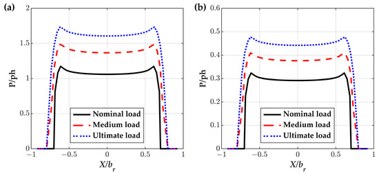 Pressure and shear stress distribution along the roller’s axis considering varying operating load. (a) pressure distribution; (b) maximum shear stress distribution.