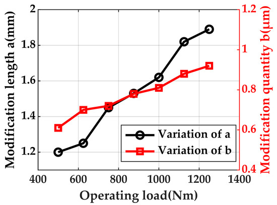 Figure 16 illustrates the optimal values of modification length a and modification quantity b which could induce the minimum oil film pressure considering various load values. With the increasing load, both the optimal modification length and optimal modification quantity rise. The result proves that a suitable roller’s profile modification could reduce stress concentration induced by heavy loads.