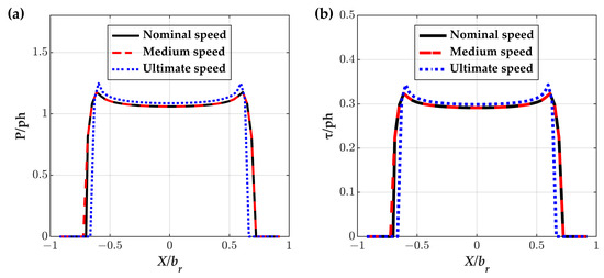 Pressure and shear stress distribution along the roller’s axis considering varying operating speed. (a) pressure distribution; (b) maximum shear stress distribution.