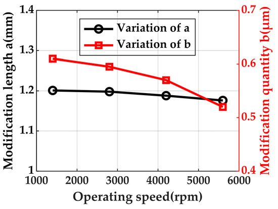 Figure 18 depicts the optimal values of modification length and modification quantity considering various rolling speed values. It is obvious that the variation of optimal modification length and modification quantity can be neglected under different rolling speeds. This is because the sliding velocity is at a relatively low level and the oil film pressure is hardly affected by rolling speed.
