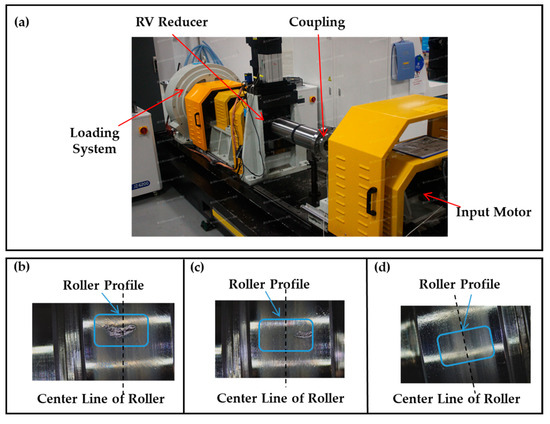 Fatigue damage induced by the three types of roller profile modification. (a) durability test rig for RV reducer; (b) arc generatrix shape roller; (c) straight generatrix shape roller; (d) combined generatrix shape roller.