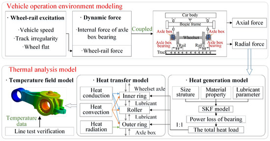 Vehicle operation environment modeling: a rigid–flexible coupled vehicle dynamic model, which integrates flexible axle boxes, is established [17]. Next, the ABB internal force is coupled into the vehicle system. Further, the dynamics coupling between track and vehicle systems is realized via the wheel–rail force, which considers the impact of track irregularity and the excitation of wheel flat. Based on this, dynamics forces along the radial and axial directions inside ABBs excited by the wheel flat are obtained. These serve as inputs for the thermal analysis model.