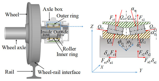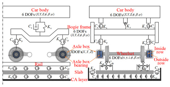 where subscripts and , respectively, represent the axle box and wheelset; denotes the bearing damping coefficient; and denote the displacements along the longitudinal and lateral directions; and and denote the yaw and roll motions. denotes the semi-lateral distance between primary suspensions. These forces act on the axle box and wheelset simultaneously, realizing dynamic coupling between ABB and the vehicle system.