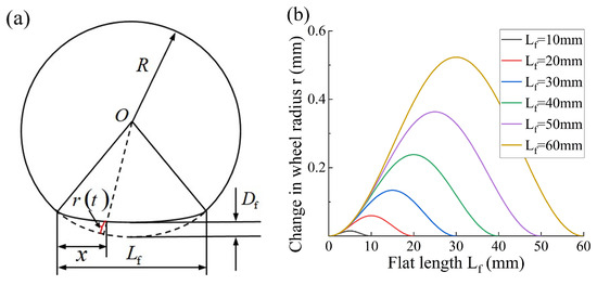 where and denote displacements of the wheelset and rail along the radial direction, and denotes the vertical irregularity of the track. In the existence of the wheel flat defect (Figure 3a), the variation in the wheel radius with the flat depth and flat length is as follows [26]: