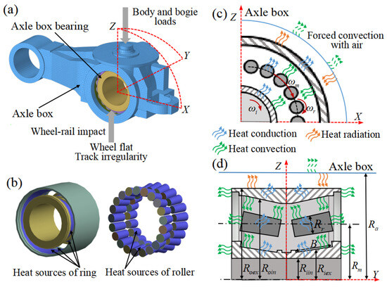 The FEM model is developed based on the parameters of ABB employed in high-speed trains [16]. The model is meshed by a hexahedral grid using HyperMesh software (Figure 5a), in which the roller contact areas are refined to ensure calculation accuracy. Subsequently, the meshed model is imported into Ansys Workbench software. Within this software, heat sources are applied (Figure 5b) and heat transfer parameters (Figure 5c,d) are set. Thus, the thermal analysis model of ABB is established. Heat is transferred between bearing components via conduction, convection, and radiation to reach thermal equilibrium. The details of the heat generation and transfer are presented as follows.
