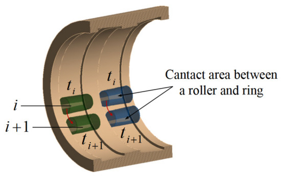 When the vehicle is in operation, the wheelset drives the ABB to rotate at high speed. As illustrated in Figure 6, the roller contacts the raceway of the outer ring at position at time ; after a shorter period, , the contact area quickly moves to position . Similarly, the contact area between the roller and the raceway of the inner ring moves accordingly. Therefore, each roller can serve as a heat source, concurrently heating the inner and outer rings. The heat load at the contact area is expressed as follows [36]: