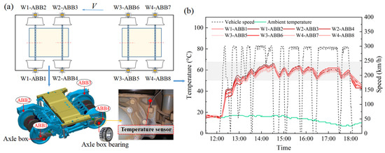 Field experiment: (a) location distribution of temperature sensors on bogies, (b) time history of ambient temperature, ABB temperature, and vehicle speed.