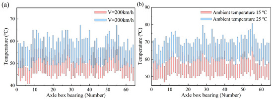 By summarizing the measured data of all ABBs on 8 cars over multiple days, the differences in steady-state temperature bands at two different vehicle speeds and under two ambient temperatures are shown in Figure 8. At = 300 km/h, due to the increased interactions, the temperature of the ABBs is generally higher than that of the ABBs at = 200 km/h (Figure 8a). In addition, the higher the ambient temperature, the higher the temperatures of the ABBs (Figure 8b).