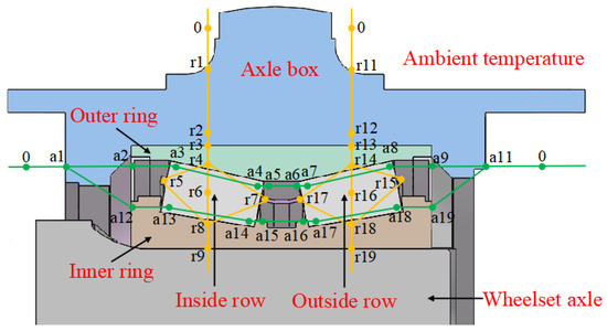 Using the proposed model, the temperature characteristics of ABBs excited by the wheel flat are investigated. Considering the almost symmetrical structure of the ABB and the discontinuities of the components (e.g., outer ring, roller, inner ring, cage, and axle box), 40 nodes in the axial and radial directions on the vertical section were selected as observation objects to analyze the temperature variations in each component of the ABB. The distribution of each node and its name are shown in Figure 9 and Table 2.