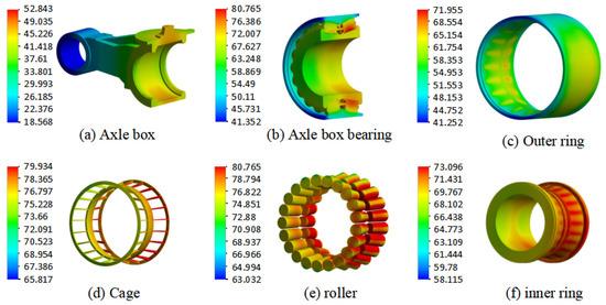 The temperature field of (a) axle box, (b) ABB, (c) outer ring, (d) cage, (e) roller, and (f) inner ring under normal conditions ( = 300 km/h).